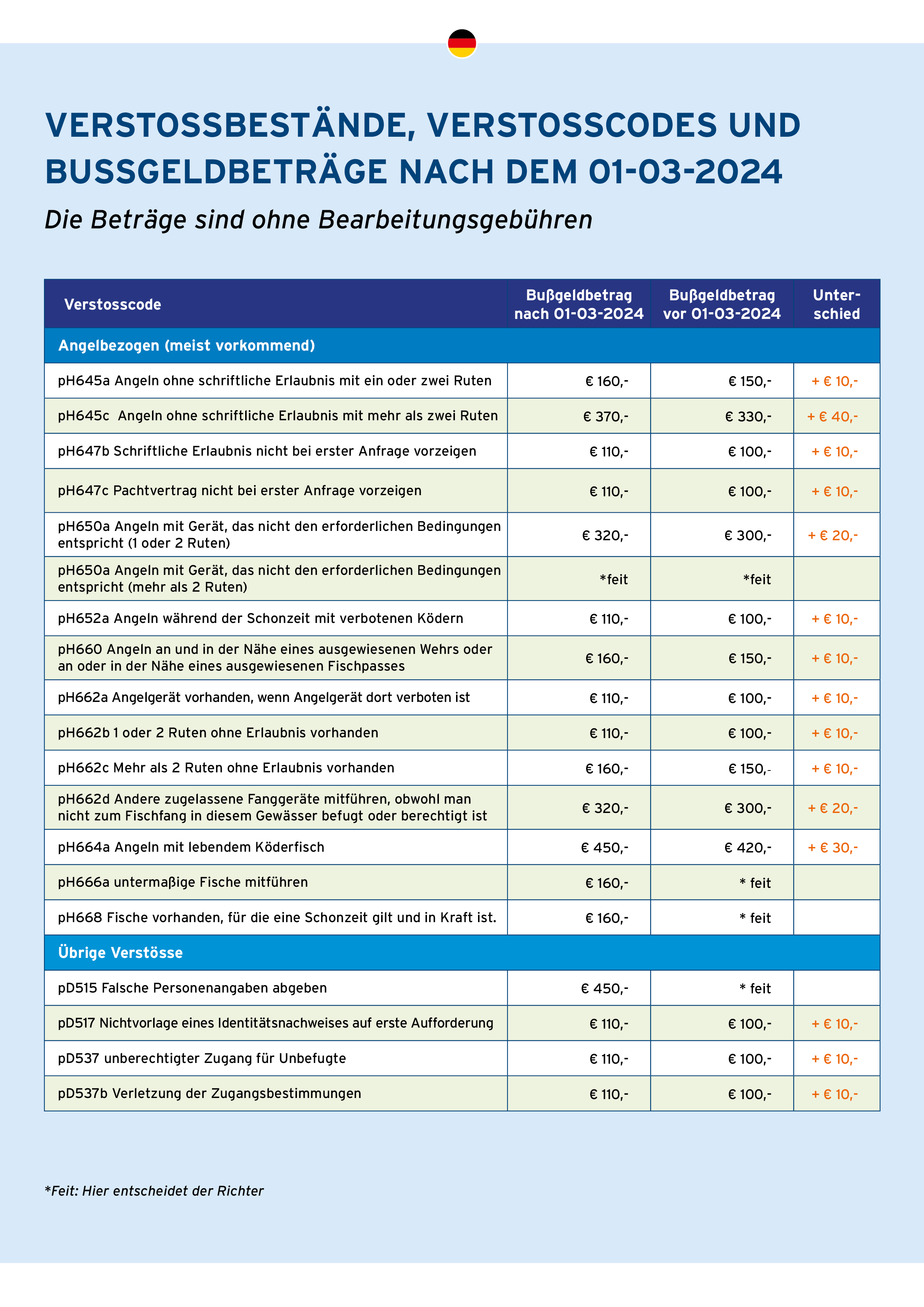 Die Staatsanwaltschaft in Holland hat die Bußgeldbeträge für das Jahr 2024 bekannt gegeben. Die Beträge für die Binnenfischerei, zu der auch die Sportfischerei gehört, sind fast die gleichen wie im letzten Jahr. Dennoch sind die Bußgeldsätze nicht unerheblich, so dass Sie eine Geldstrafe am Wasser vermeiden sollten.